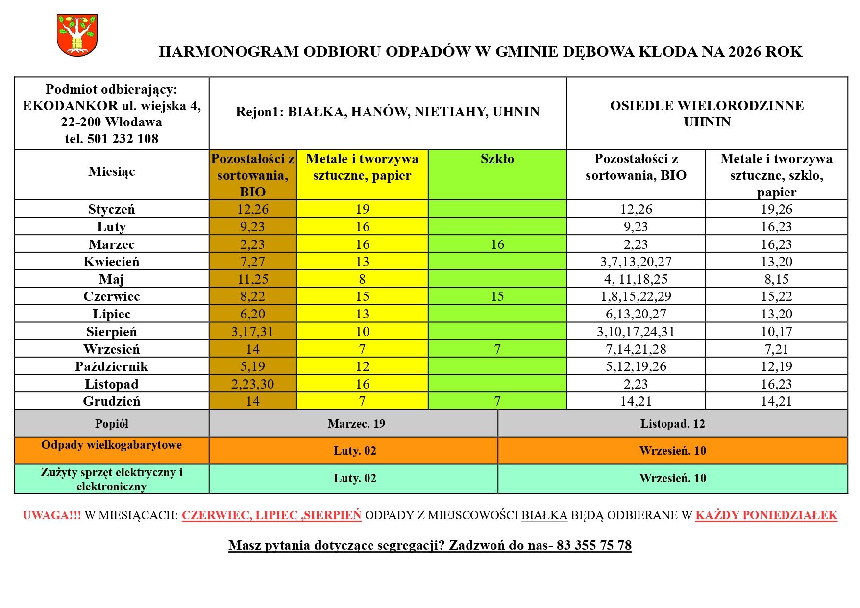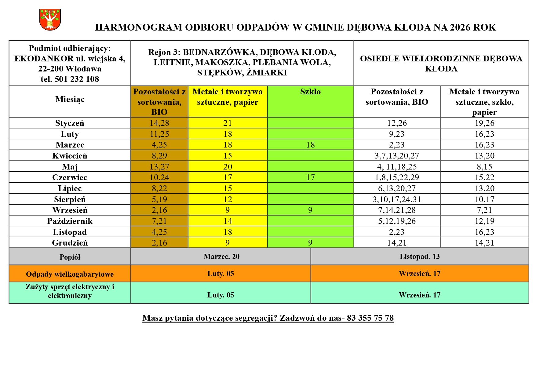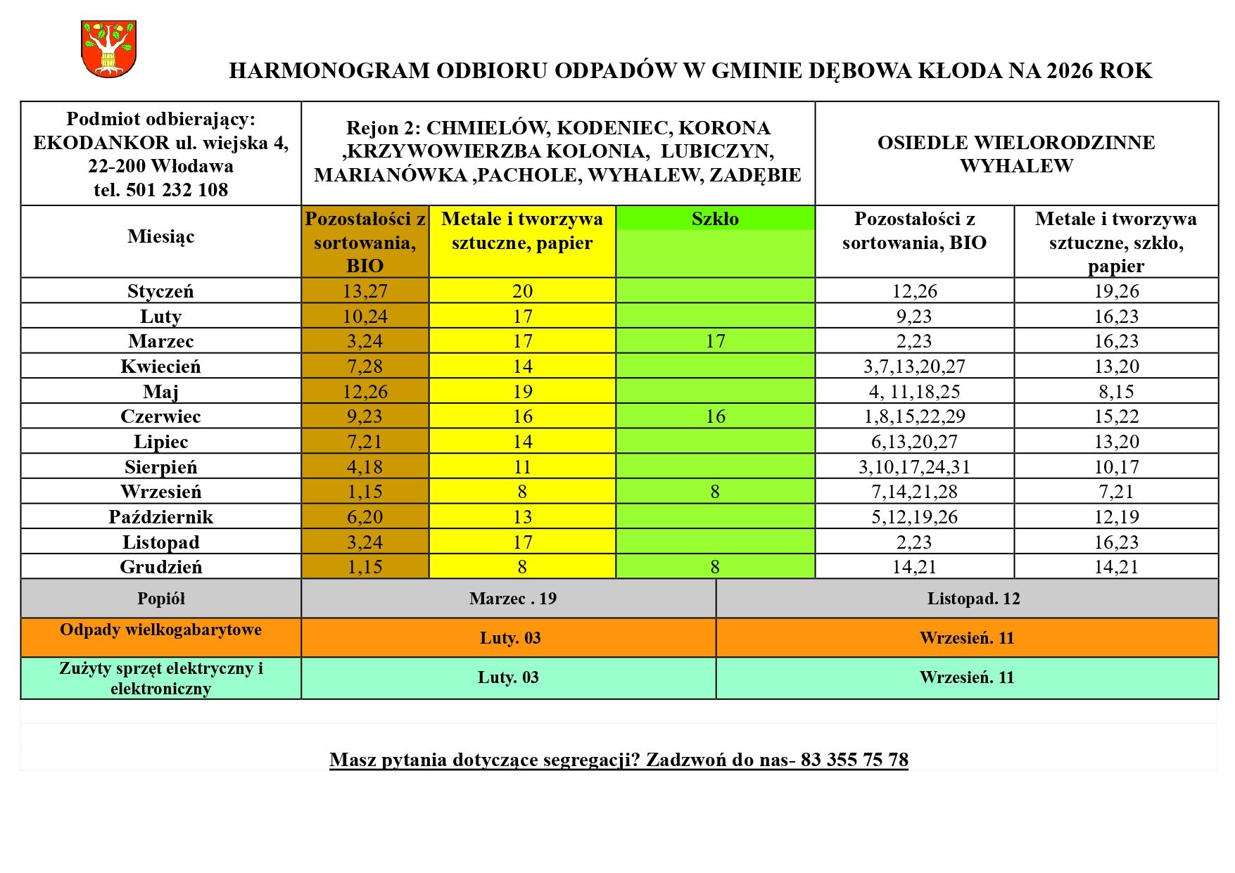 HARMONOGRAM ODBIORU ODPADÓW W GMINIE DĘBOWA KŁODA NA 2026 ROK